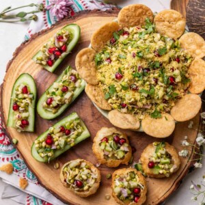 A super creative way to make chaat by using bread as base and topping it with all the chaat essentials – boiled potatoes, onions, coriander chutney, imli chutney and sev. This is like a cross between sev puri and dahi vada and its so so good.