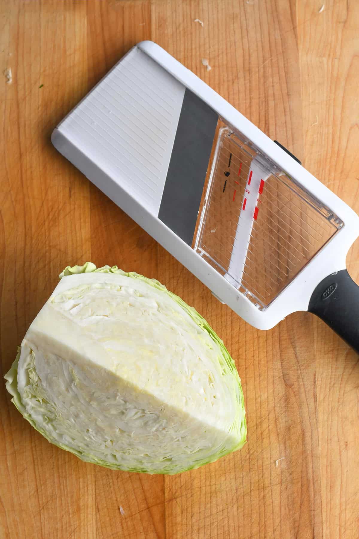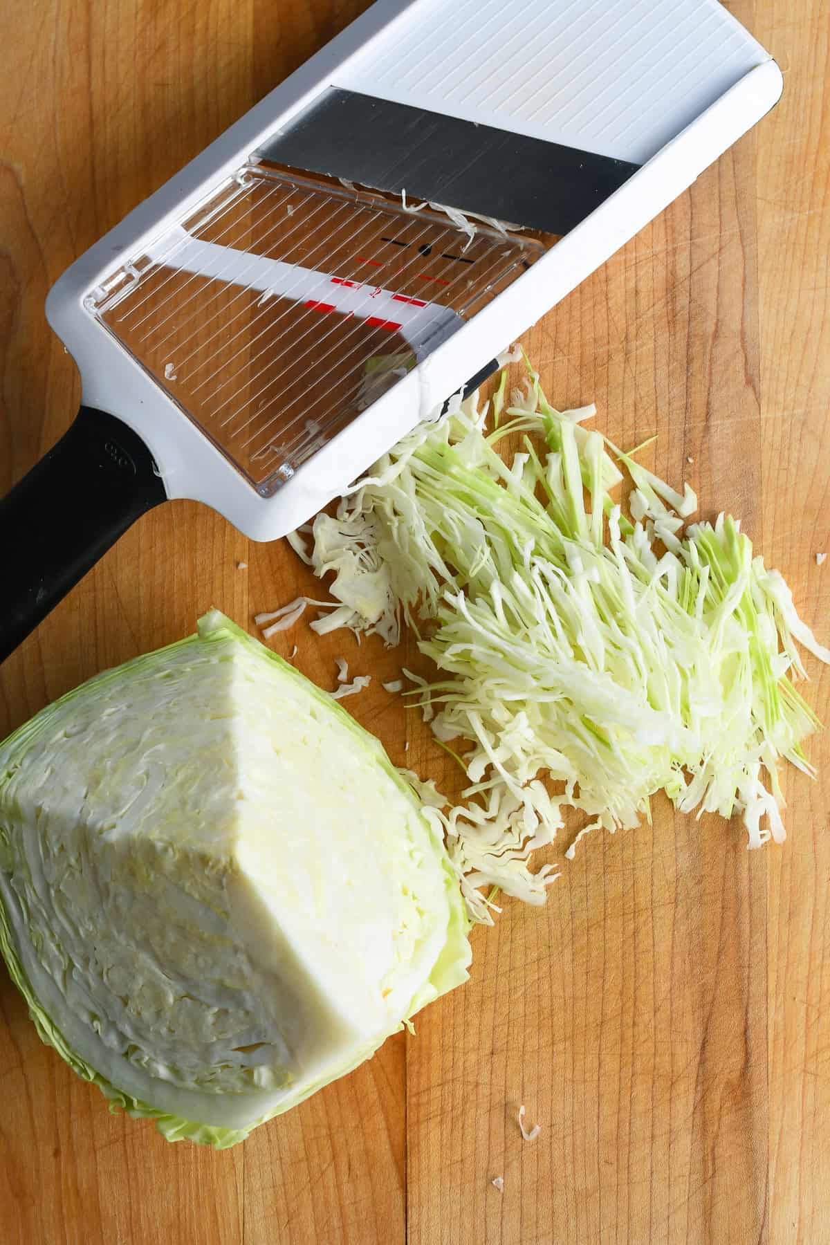 Step 2: Use a mandoline to shred the cabbage. Starting at the tip shred the cabbage around the core to get thin slices.