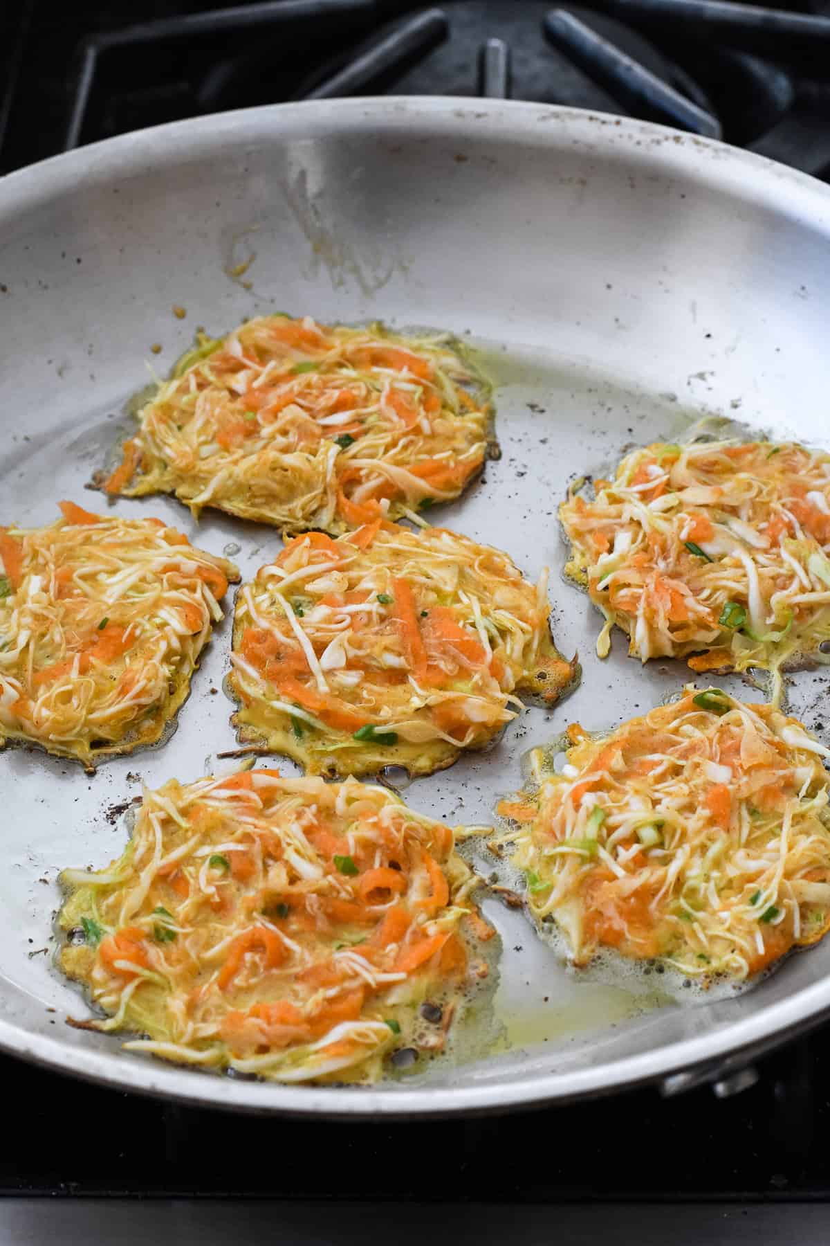 Step 4 – Scoop and cook. Heat a large pan and add ghee. Once hot use a 1/8 cup measuring cup or 2 Tablespoon cookie scoop to scoop out the cabbage mixture. Drop into a heated pan and use a spatula or your fingers to press down and flatten into a small patty about 1/4 “ thick. Don’t overcrowd the pan.