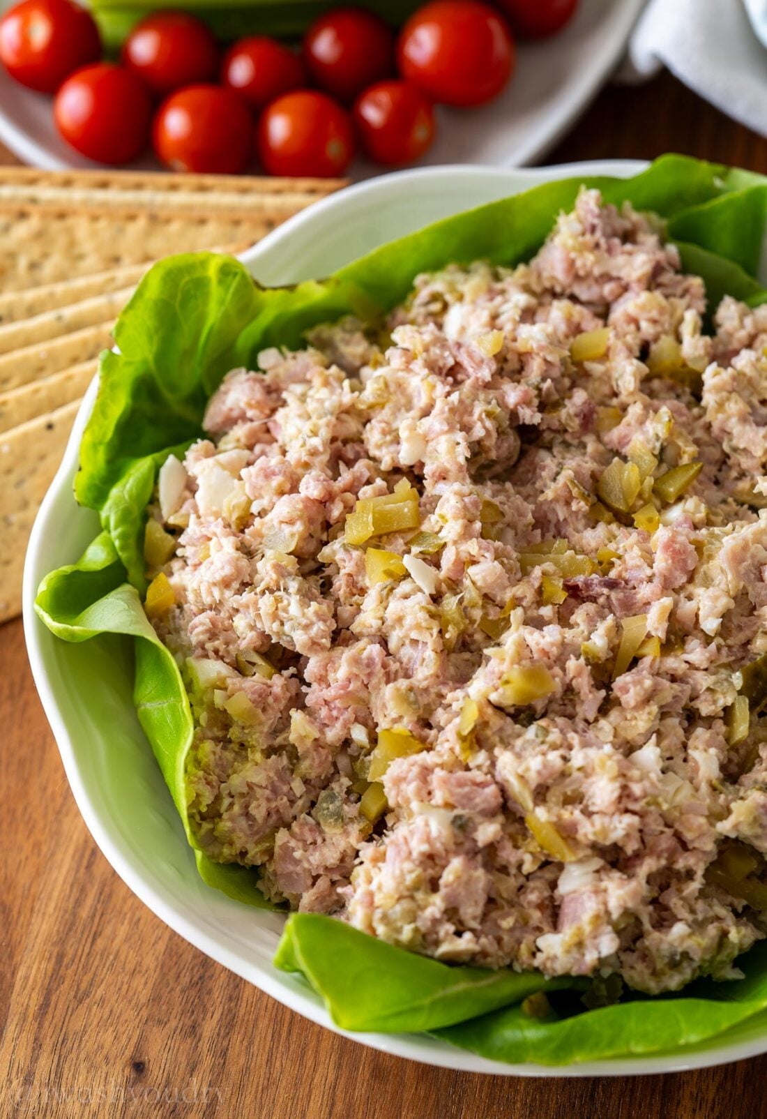 Take leftover ham to the next level with this quick and easy Chopped Ham Salad Recipe. It’s filled with cooked ham, pickles, chopped hardboiled eggs, mustard and mayo. I took my vintage and viral Monkey Meat recipe and amped it up with hard boiled eggs for some extra protein, and added a little mustard for…
