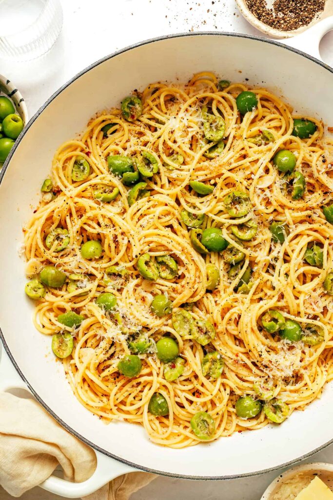 The anchovies melt completely into the butter (don’t skip them, I promise you won’t taste “fish”), the vodka cooks down into something mellow and almost sweet, and the Castelvetrano olives bring this buttery richness that ties everything together. It’s one of those recipes that tastes like way more than the sum of its parts. I made it for friends recently and people are still texting me about it!