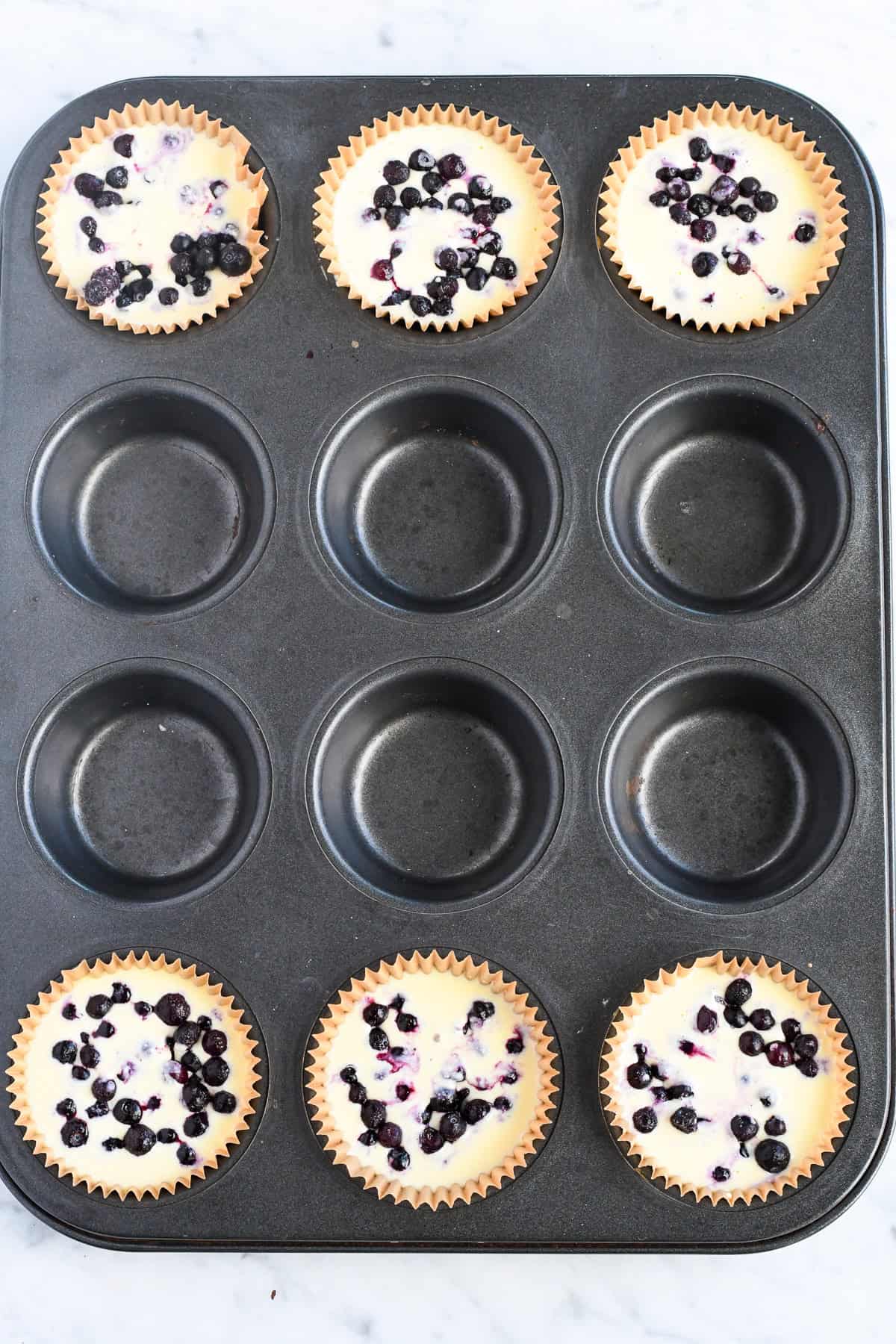Step 6: Top with 1 tablespoon blueberries. Gently mix the blueberries in each muffin tin. Just a little mixing, don’t over mix.