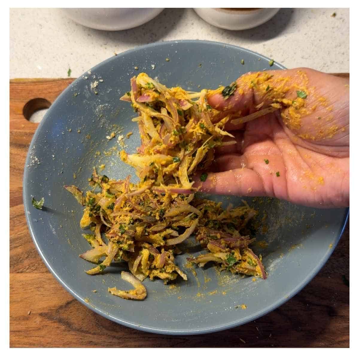 In a bowl, add all the pakora ingredients except water & oil and mix them well, preferably with your hand. Add water a tablespoon at a time and mix well to create a light batter that coats all the onions.
