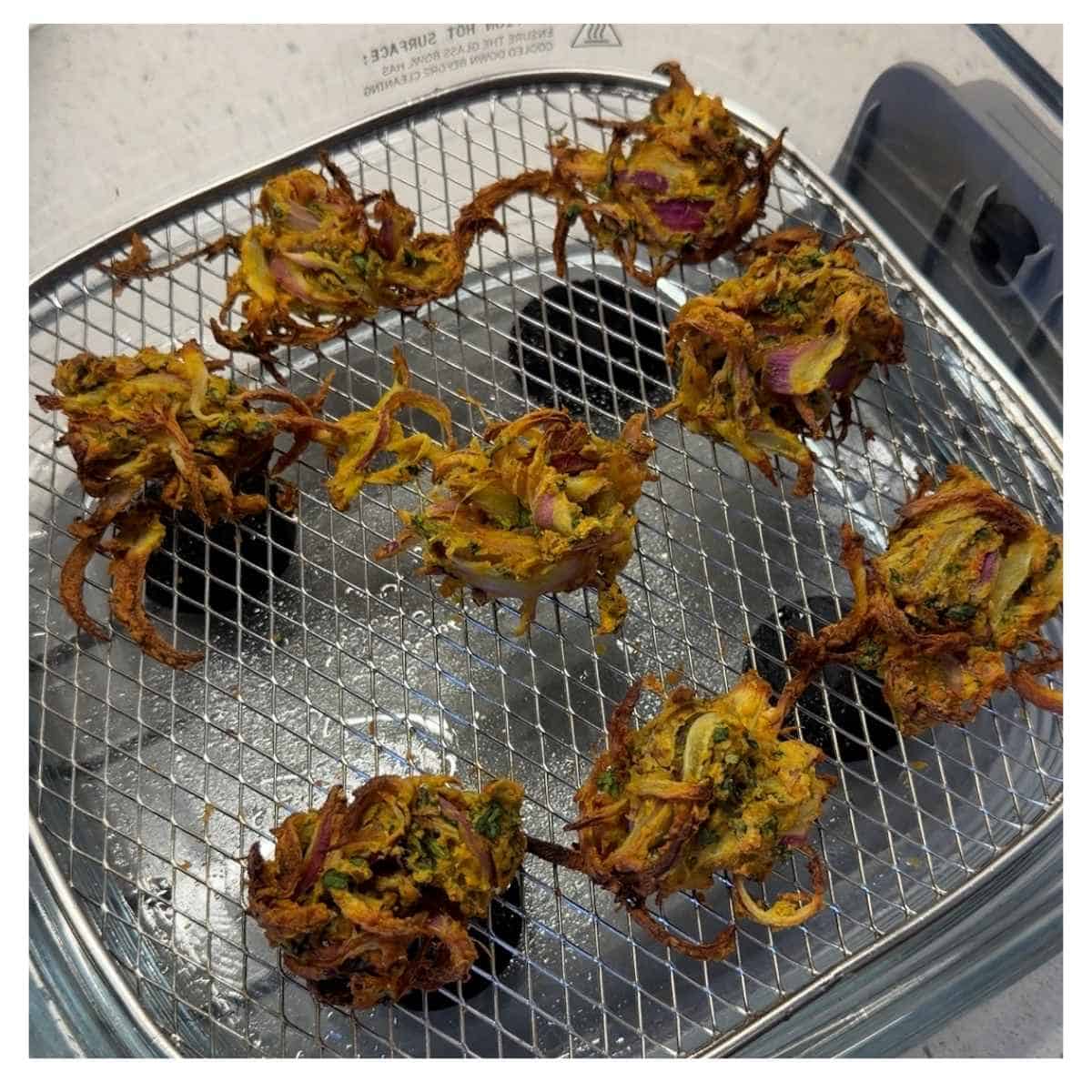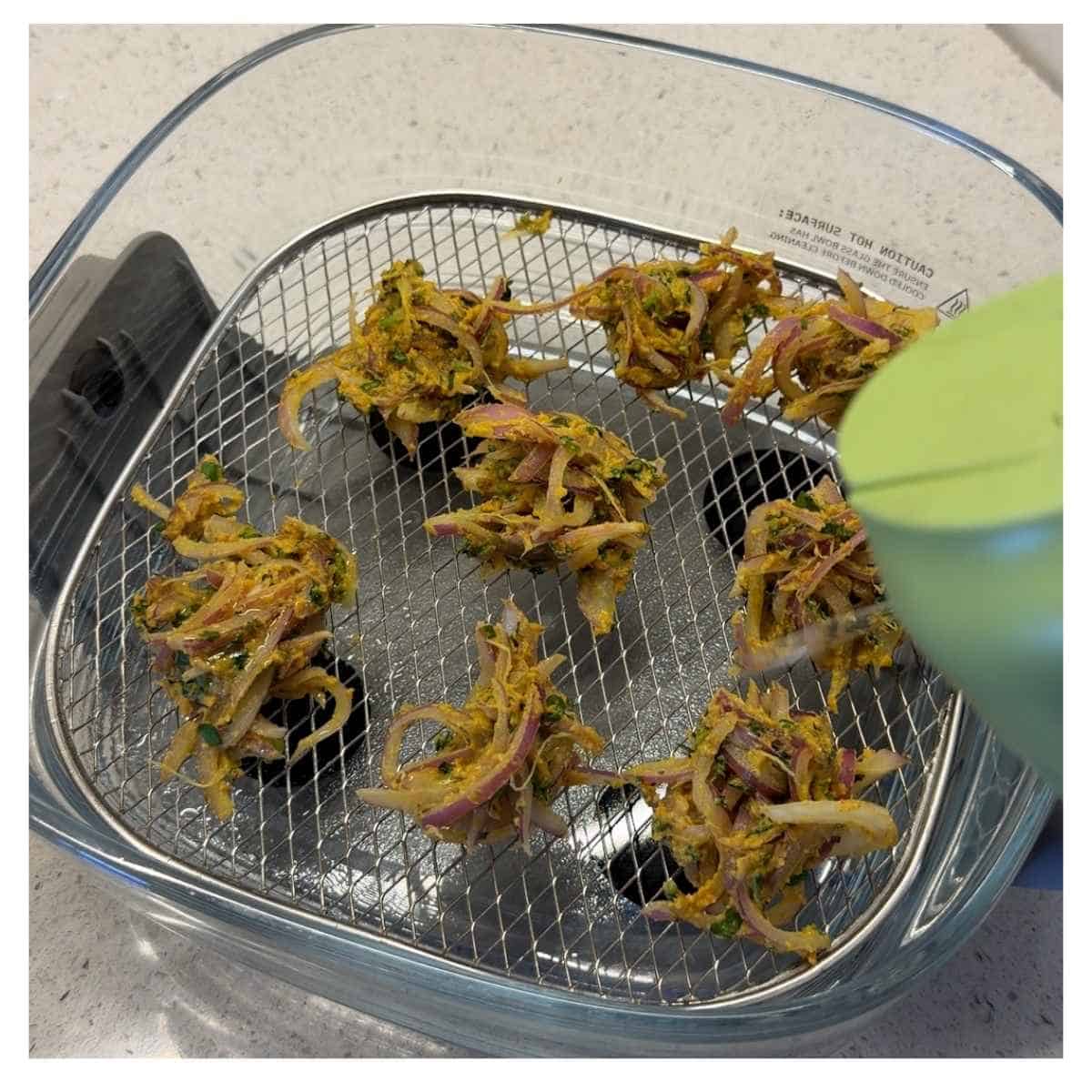 Brush the pakodas with oil. Air Fry the pakodas at 170C for 4 minutes on each side, flipping once and brushing the other side with