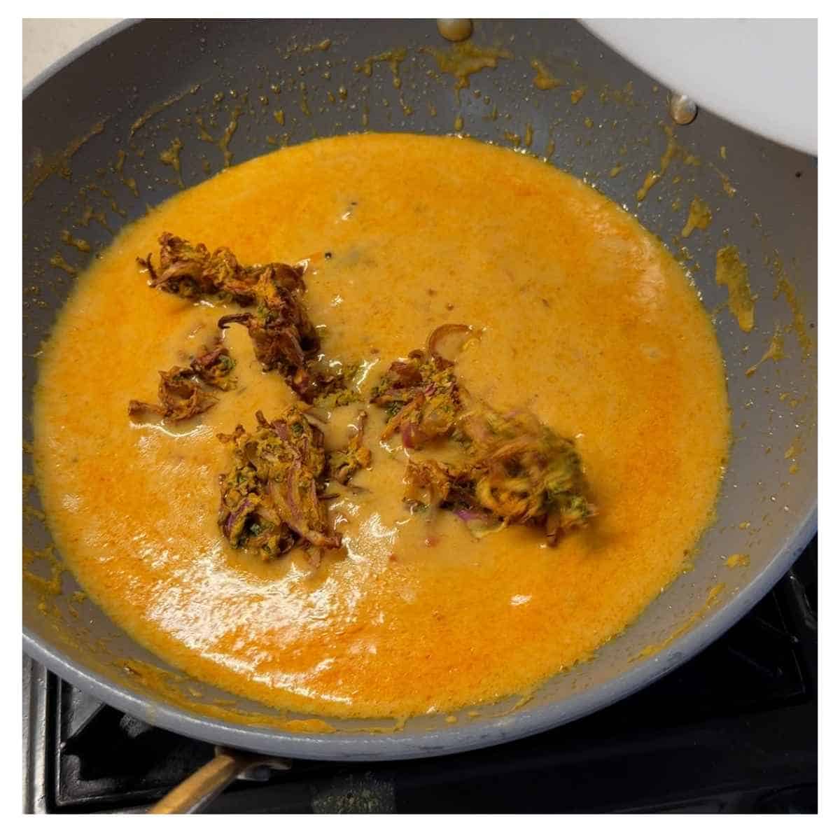 Bring the kadhi to a quick boil if it has cooled down, add the pakodas and simmer for 2 minutes.