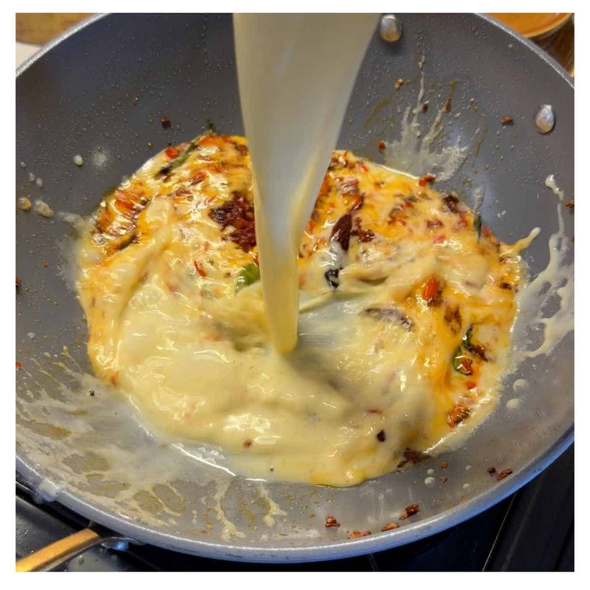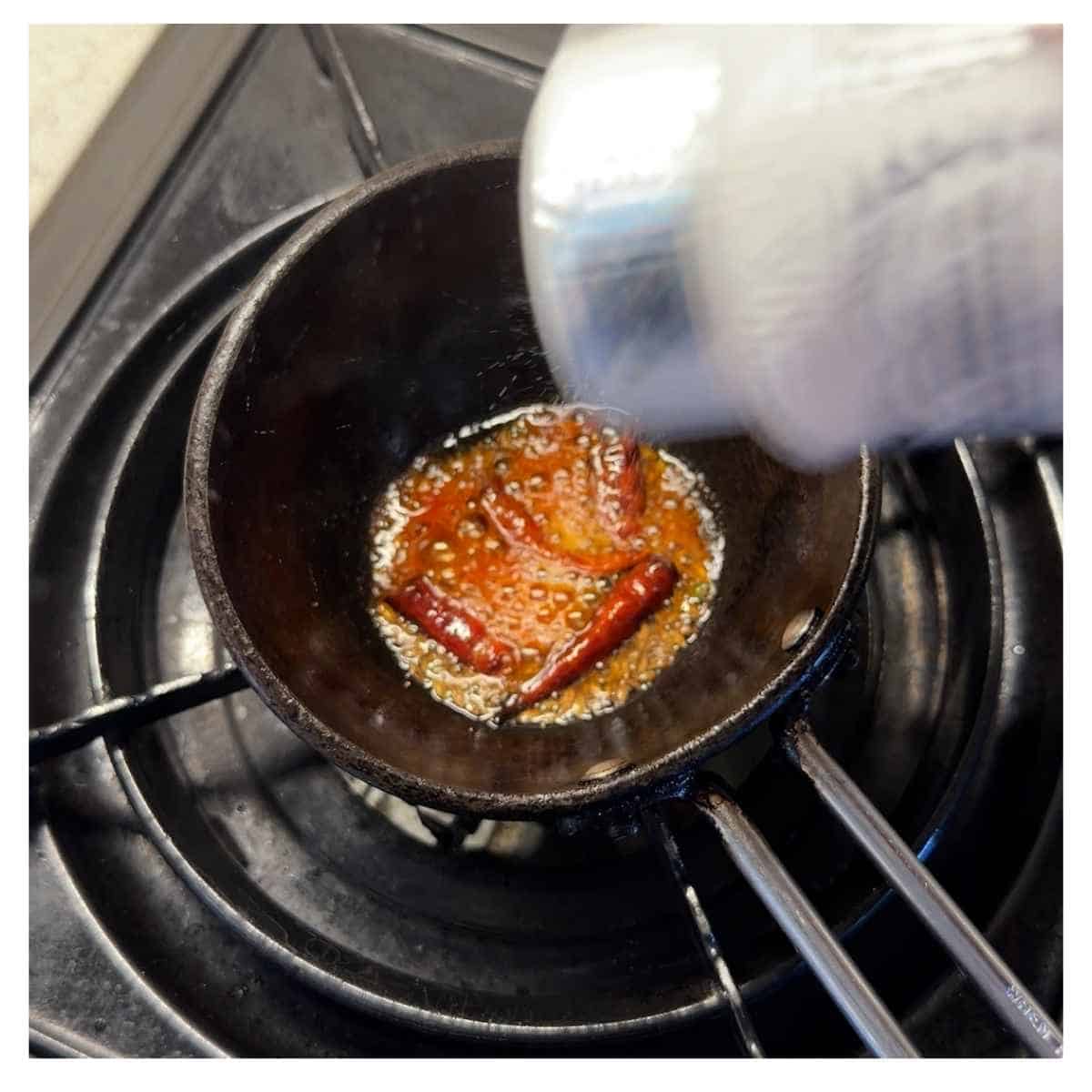 Immediately pour the tadka over the kadhi. (Don’t delay, or the red chilli powder can burn)