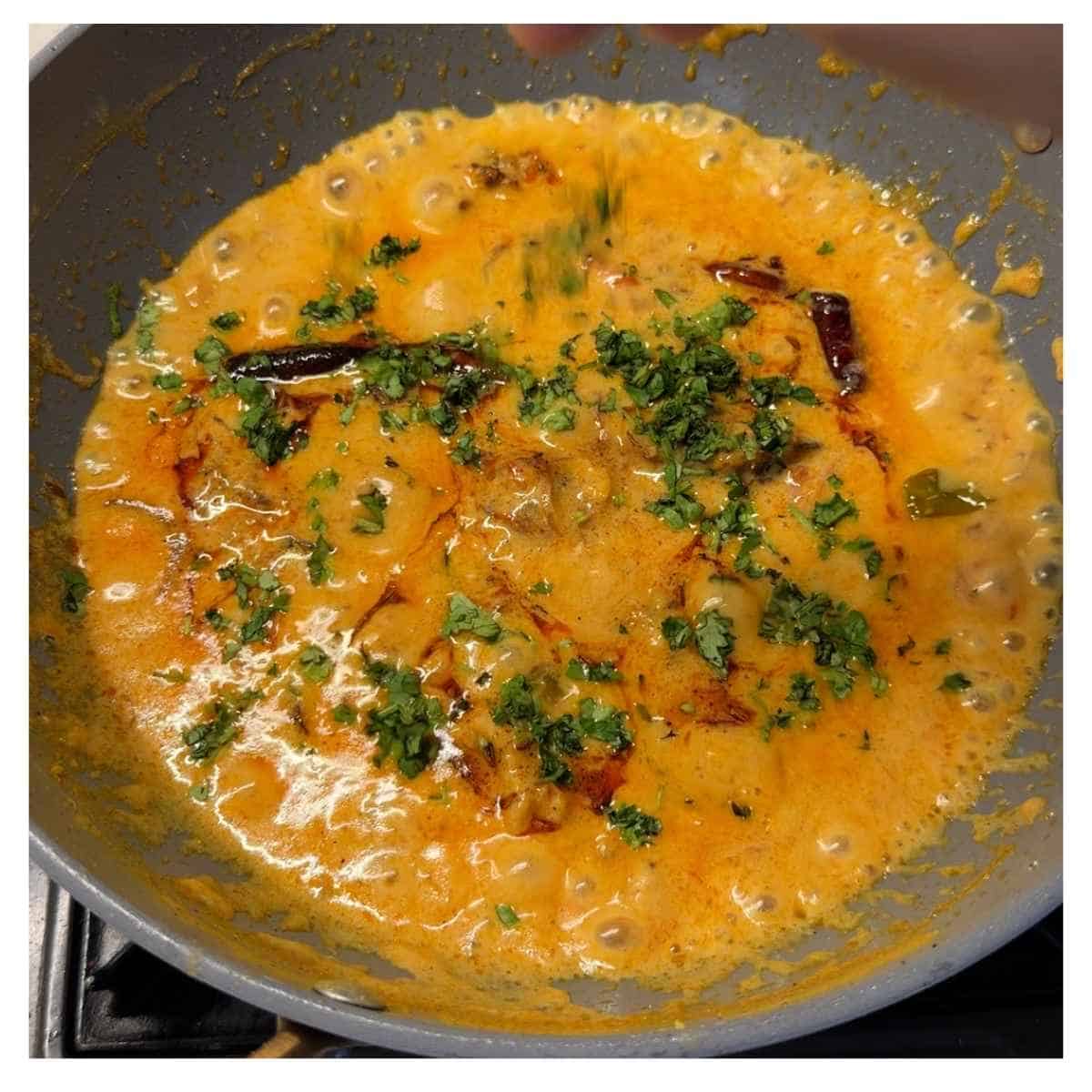- Make sure to simmer the kadhi well. This kadhi gets its signature creaminess and flavour from this step!