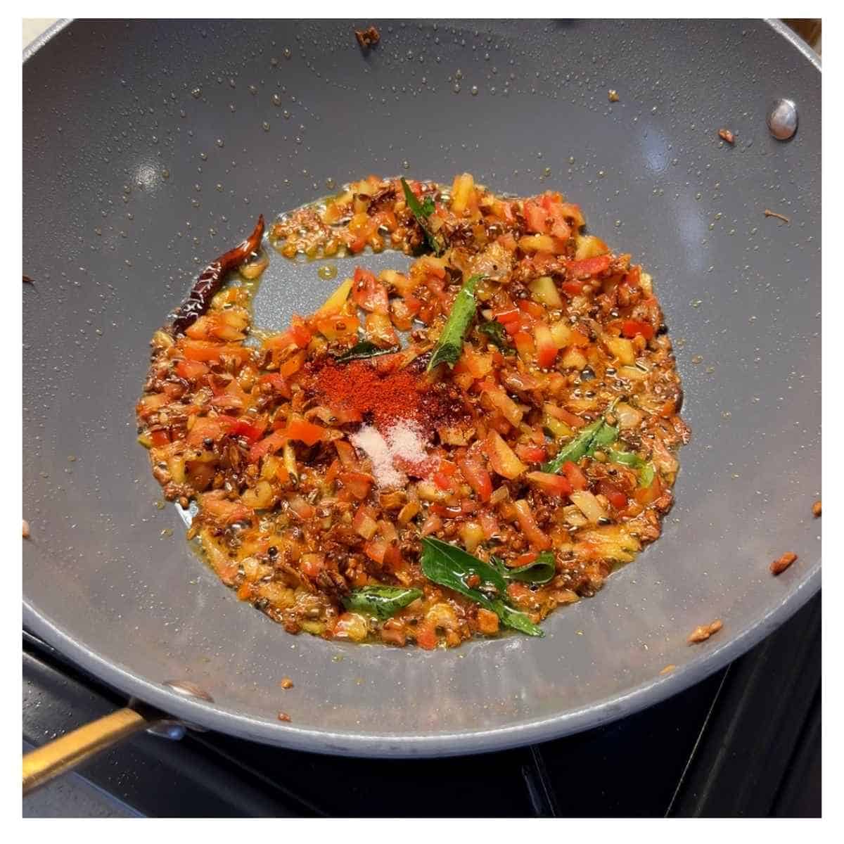 Spices: This recipe uses a mix of powdered spices such as red chilli, coriander, and dry mango along with whole spices like carrom seeds and fenugreek seeds for flavor, warmth, and aroma