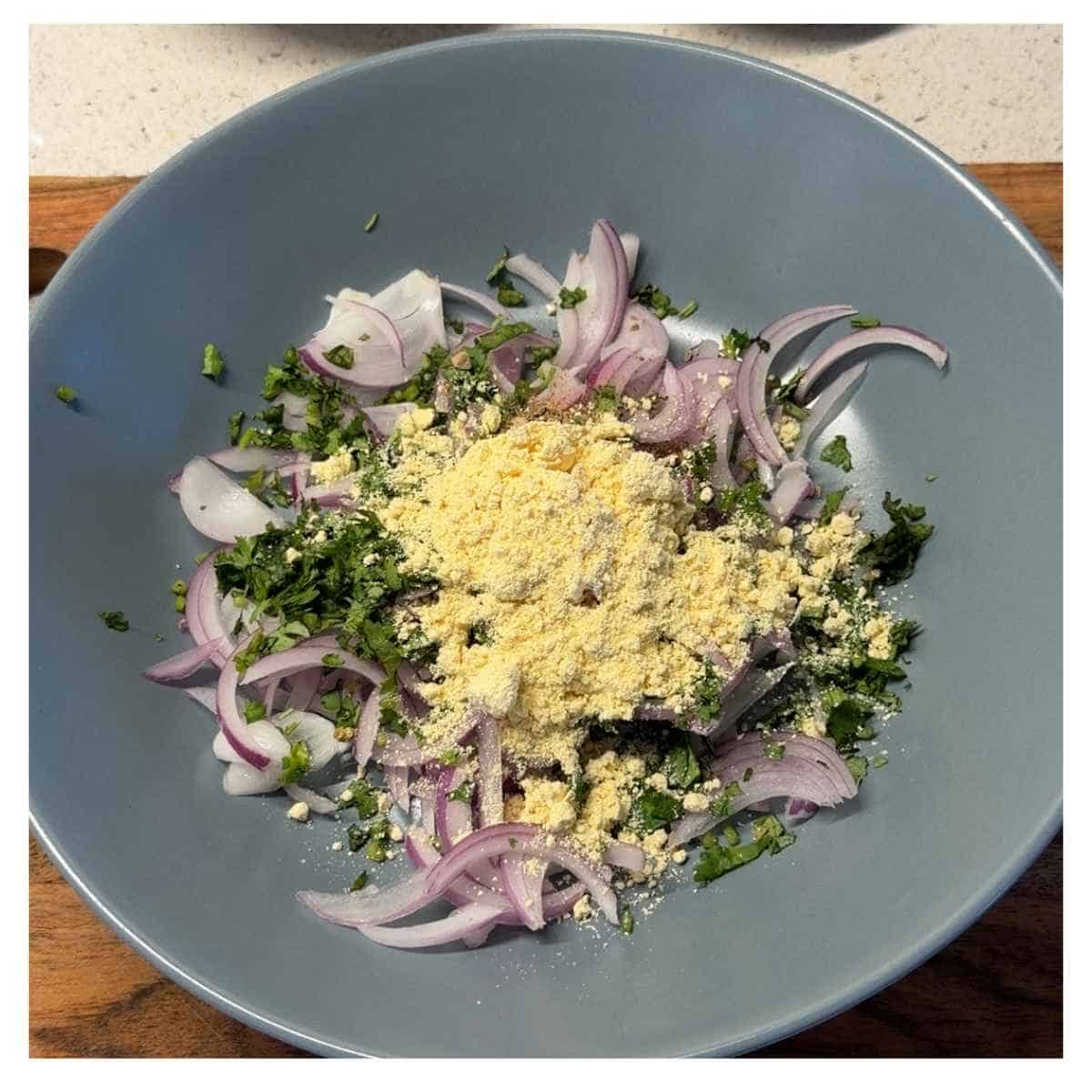 Gram flour: Mixed in with water and spices to make a batter to coat the pakodas in