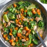 An easy one pan skillet dinner of golden, juicy chicken thighs gently simmered in a flavorful coconut-ginger sauce, surrounded by tender bites of sweet butternut squash, nutrient-rich broccoli and silky spinach. It’s nourishing, delicious, and ready in about 30 minutes.
