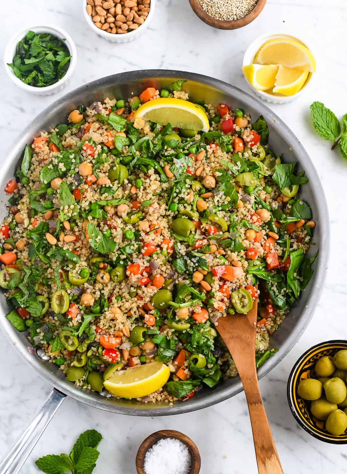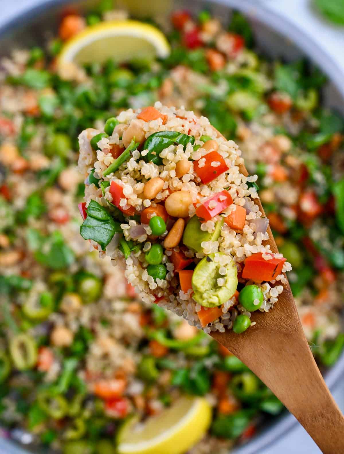 This Mediterranean quinoa with vegetables is a healthy, protein-rich vegan dinner made with fluffy quinoa, fresh vegetables, chickpeas, herbs, and lemon—and it comes together in under 30 minutes.