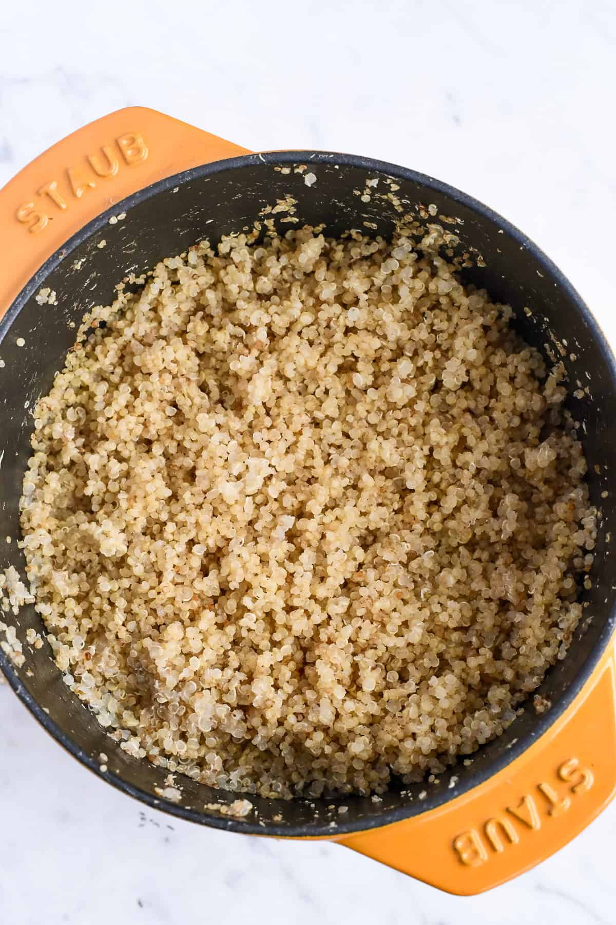 6. Add the quinoa and spinach. Once the quinoa is ready, add the quinoa and spinach. Mix for 2 minutes until spinach is wilted. Remove from the heat.