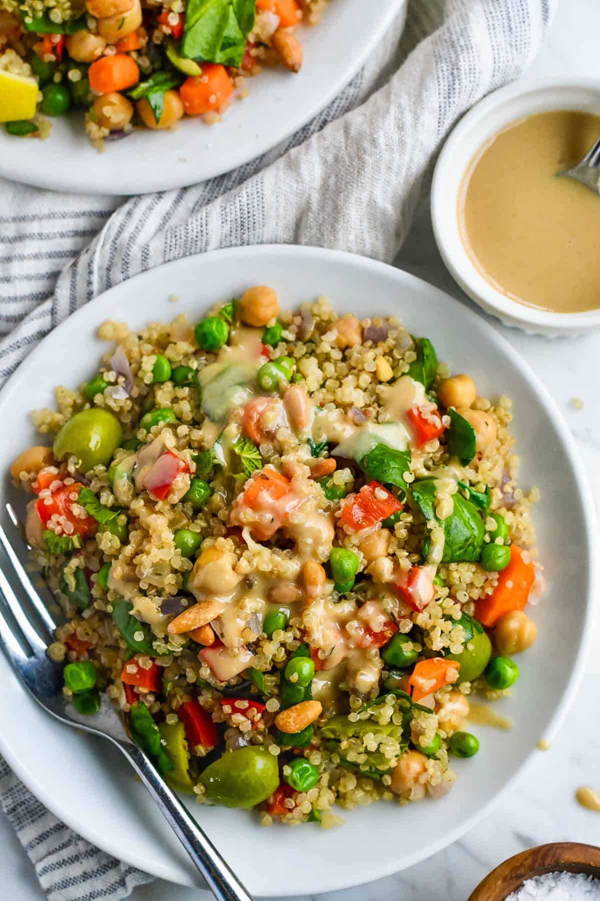 Mediterranean Quinoa with Vegetables on plate with fork drizzled with tahini