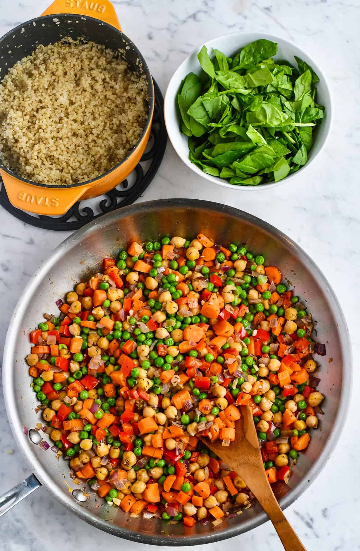 Mediterranean Quinoa with Vegetables cooked vegetables with quinoa and spinach ready to be added