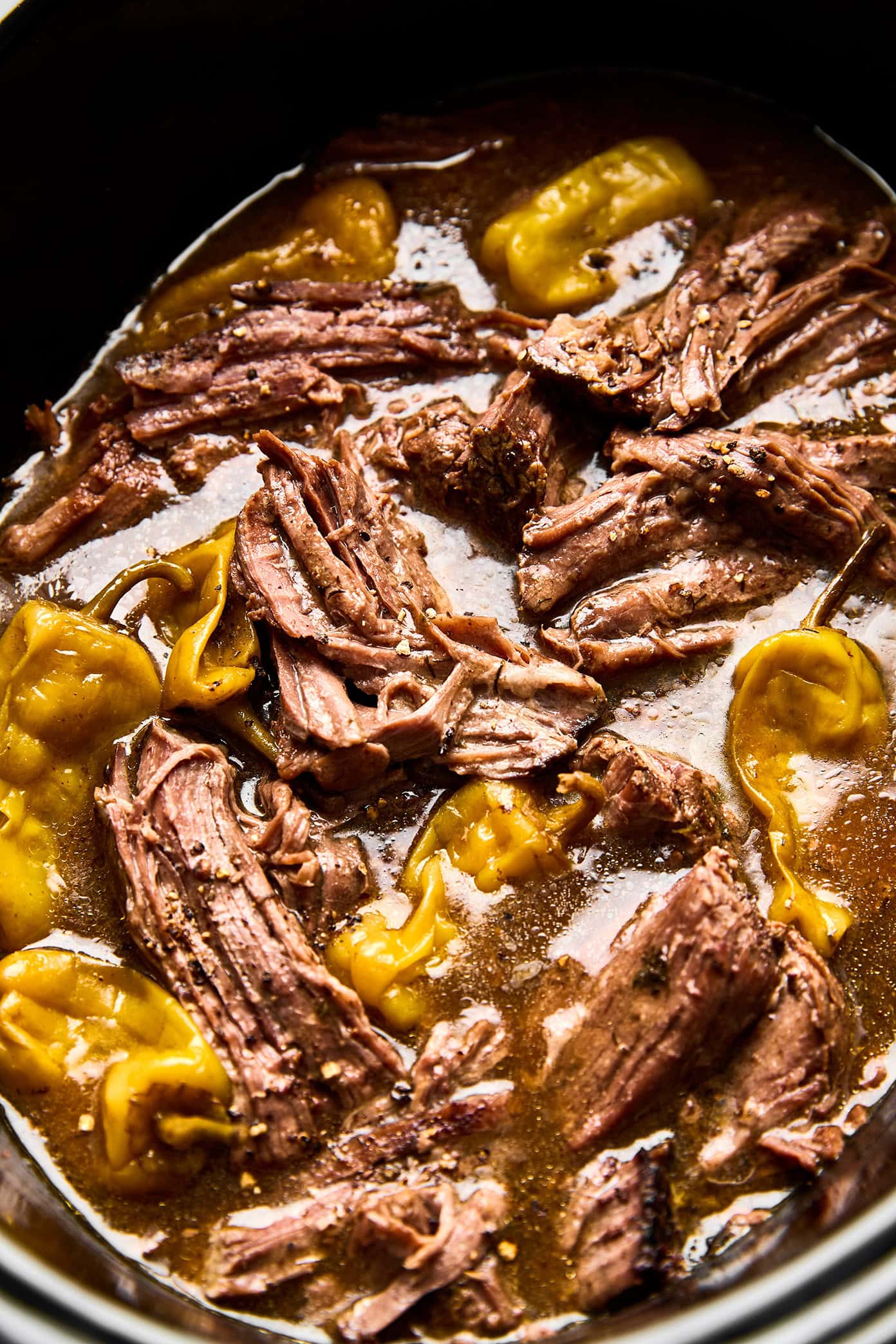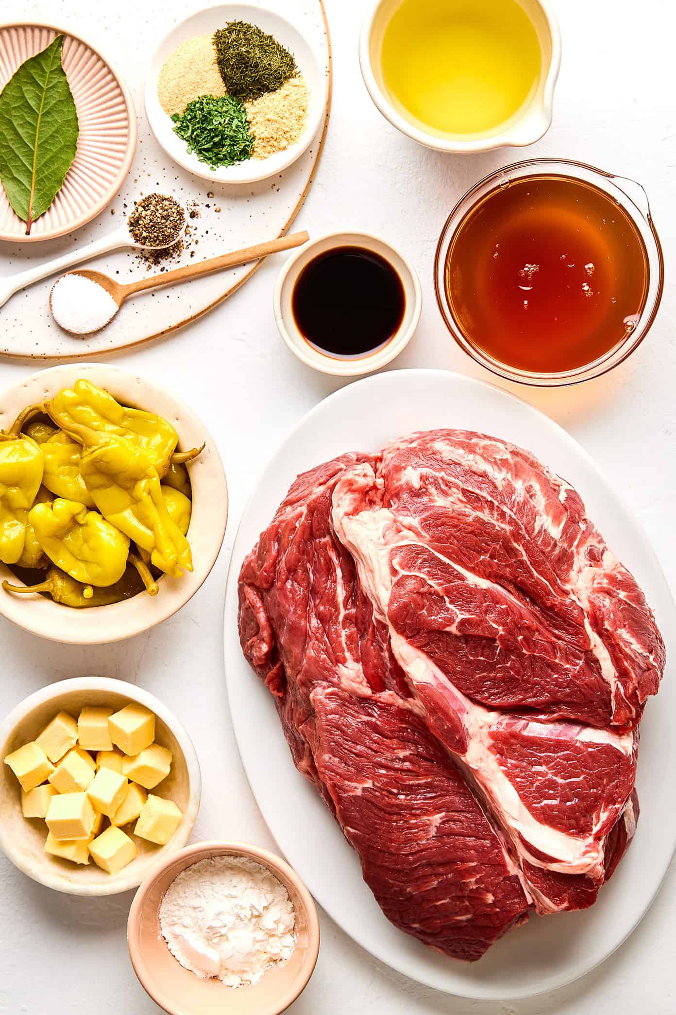 • 12 pepperoncini peppers + 1/2 cup pepperoncini juice