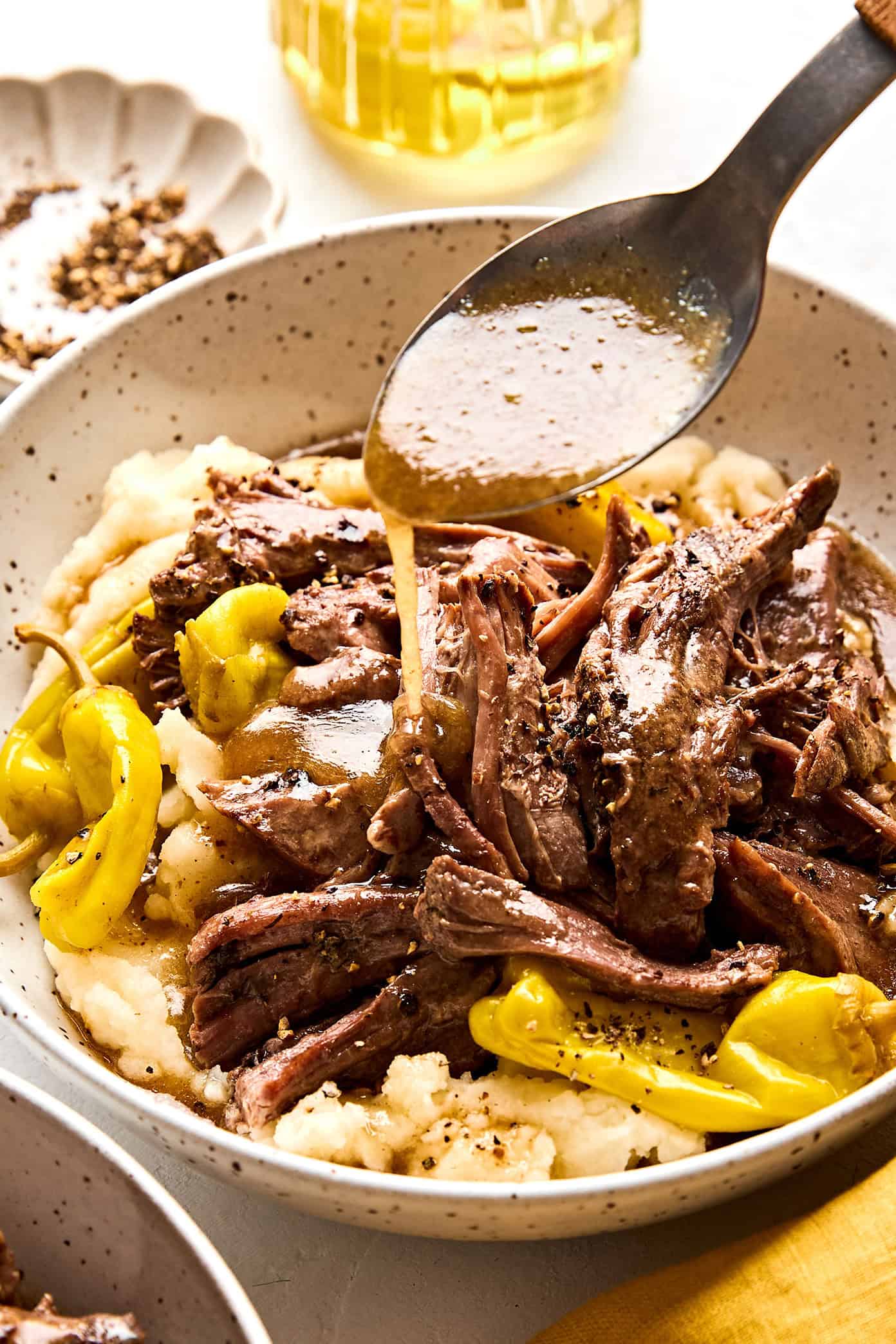 Instead of using the traditional au jus and ranch seasoning packets (which often include extra preservatives and artificial flavorings), this recipe relies on a simple blend of beef stock, pepperoncini, butter, and basic seasonings. It only takes a minute or two more to measure everything out, and the flavor is every bit as rich, tangy, and buttery as the original.