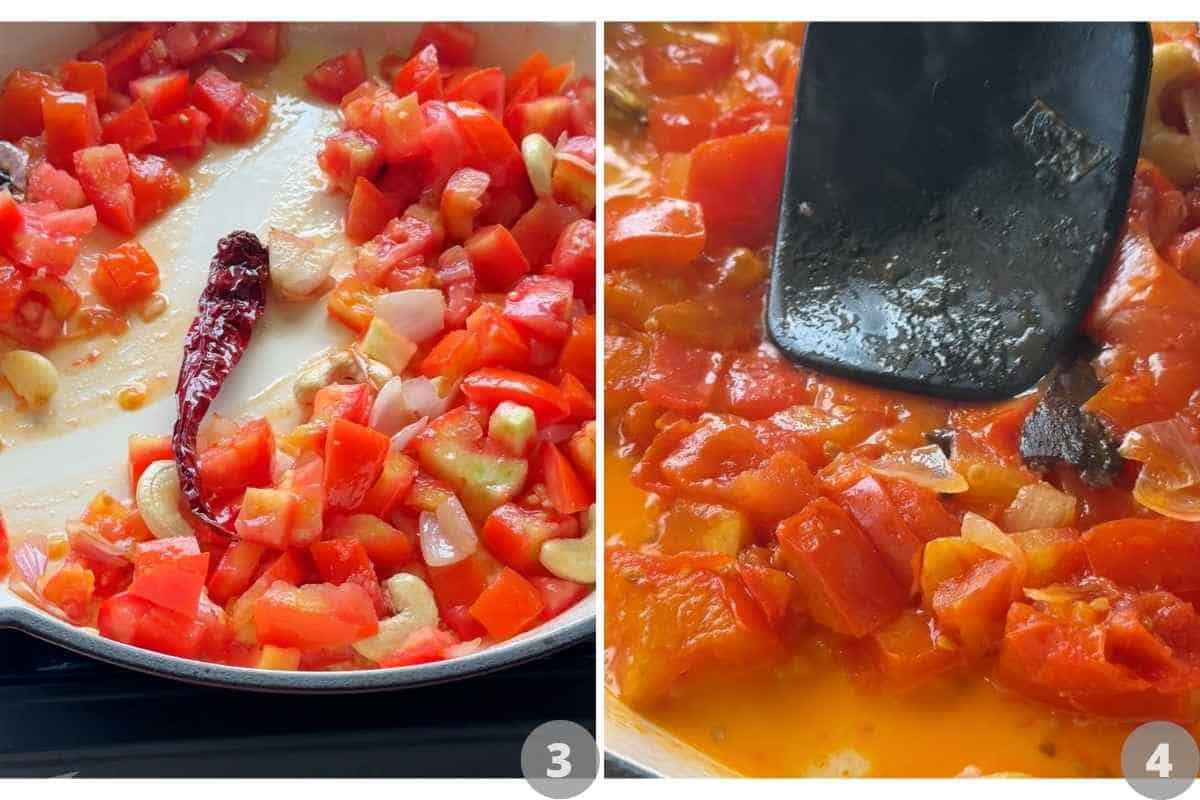 • For the gravy, heat 1 tablespoon oil and 1 tablespoon butter in a skillet or pan. Add cinnamon, cardamom, cloves, whole red chilies and garlic. Saute for a minute or so till fragrant. Add onions and saute on high heat for 2-3 minutes till pink and translucent. Add tomatoes and cashew nuts. Mix once, reduce the flame to a simmer and cover and cook for 10-15 minutes till the tomatoes start breaking down and becoming pulpy.