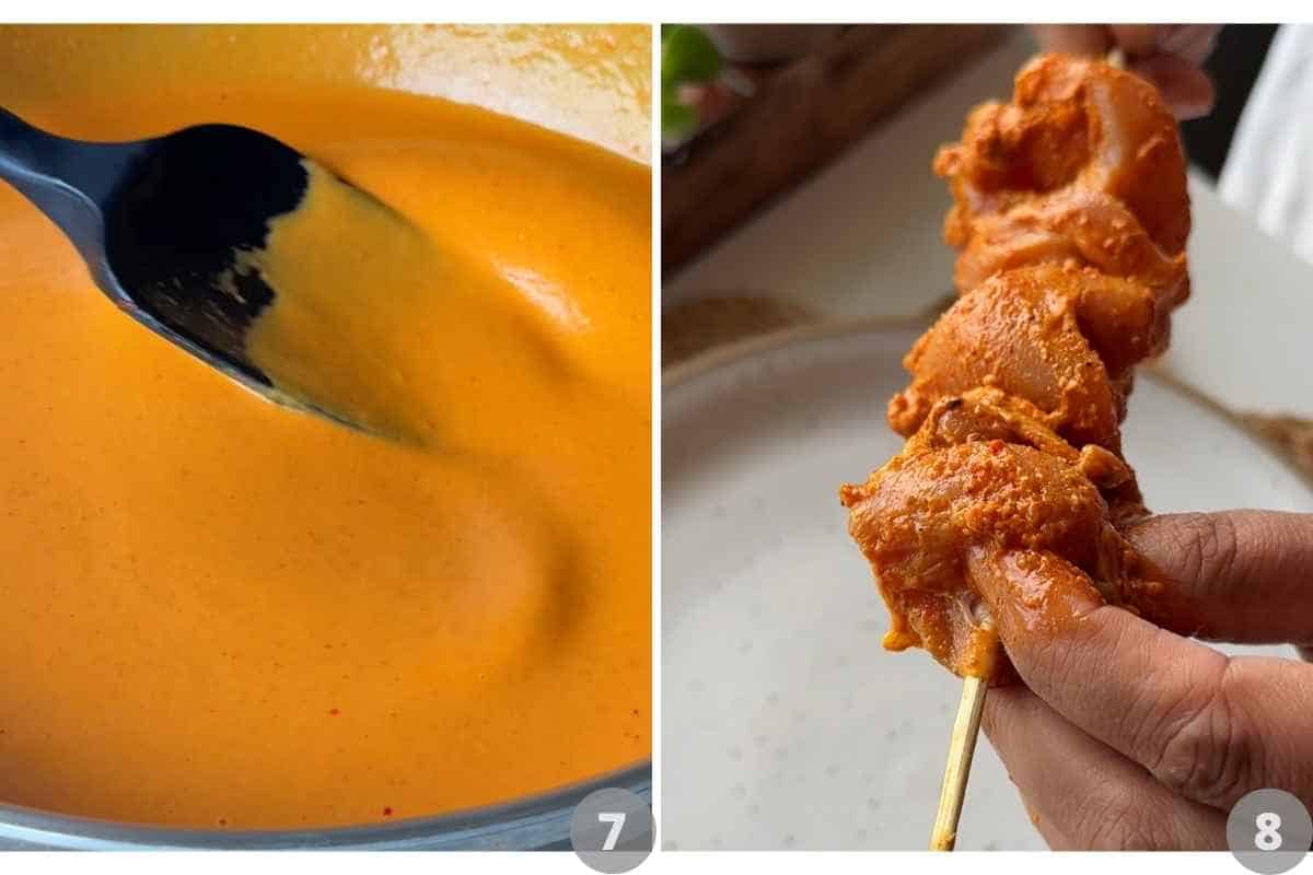 Skewer the marinated chicken and keep them ready to cook.