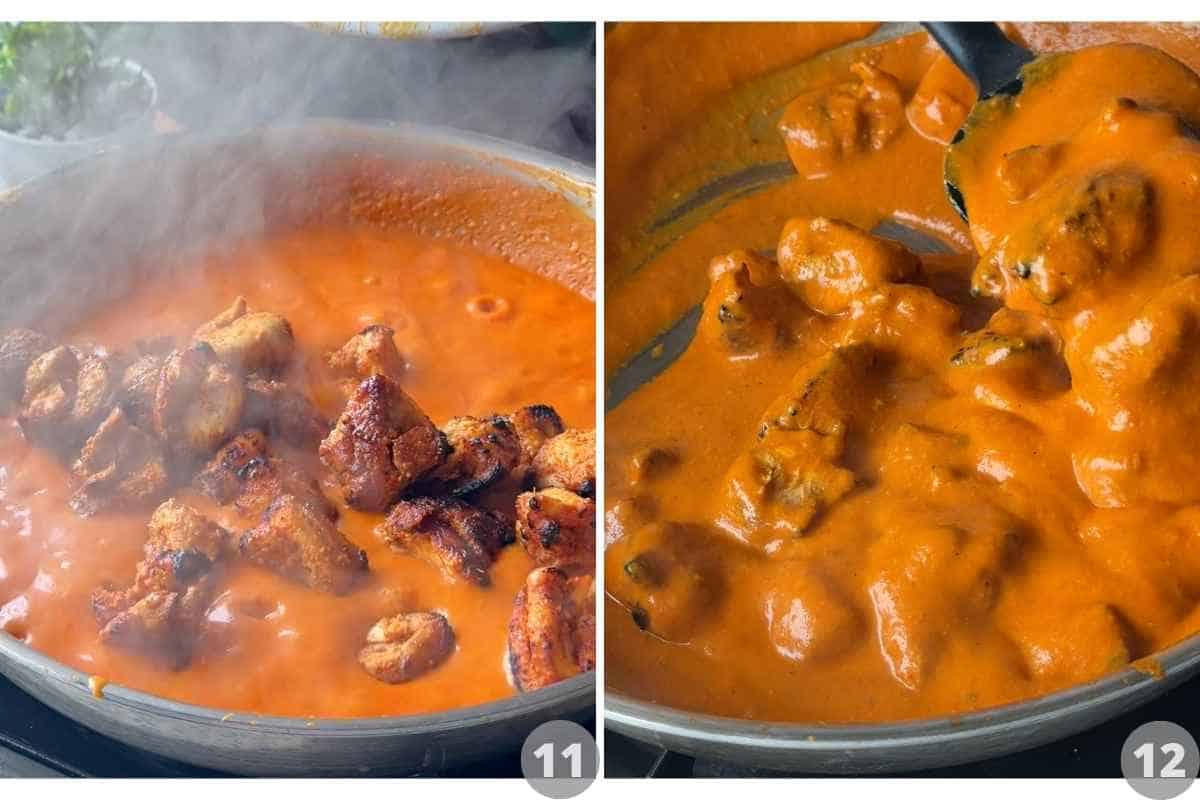 • Add the chicken pieces and simmer for 10 minutes. Stir in the kasuri methi and fresh cream.