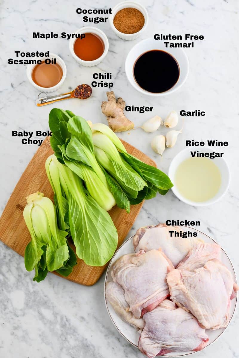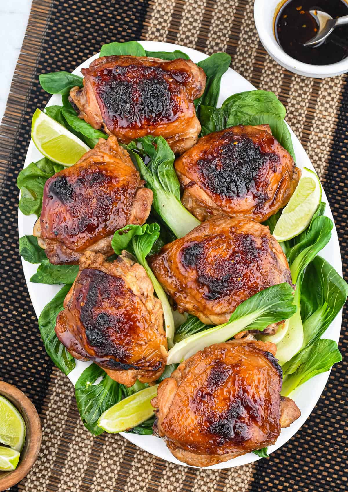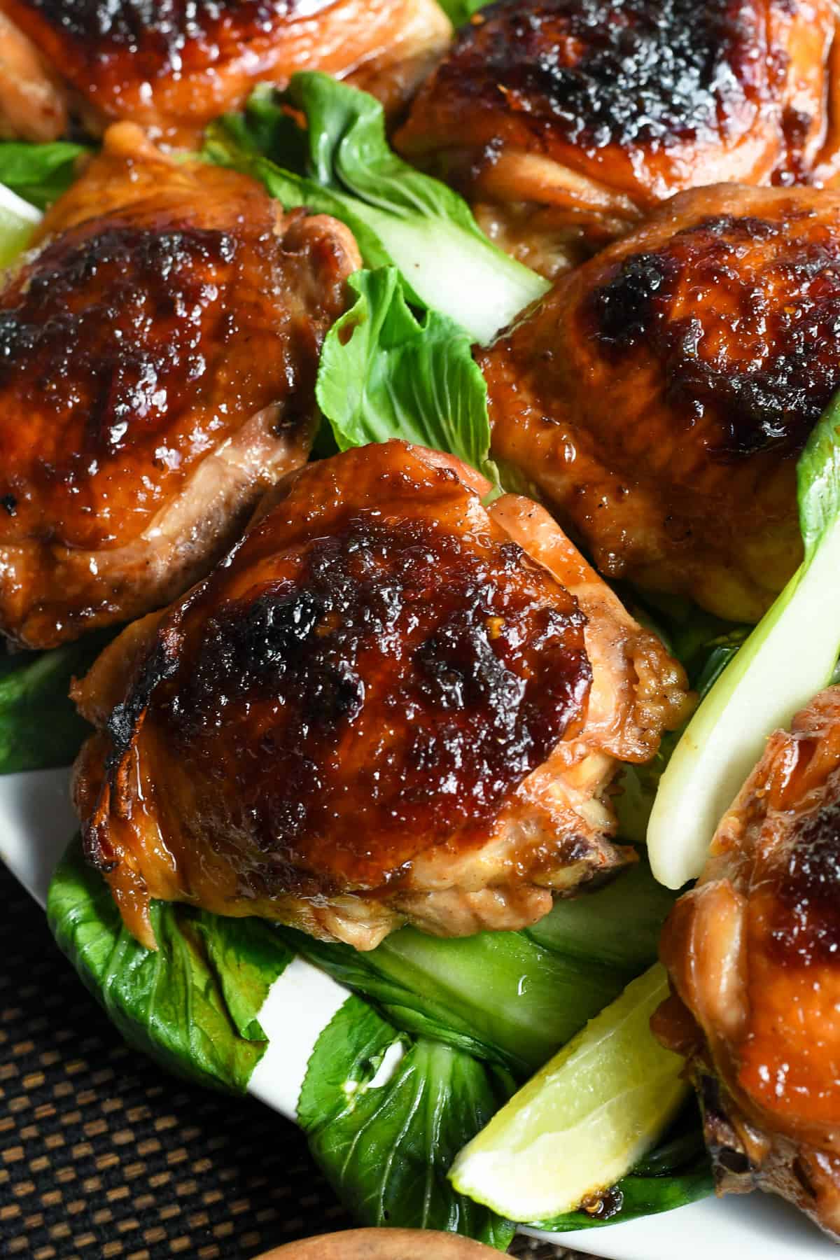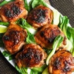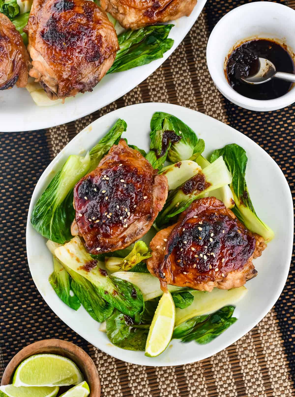 9. Place the steamed bok choy on a platter. Place the chicken thighs on top and drizzle with a little sauce. Serve remaining sauce on the side.