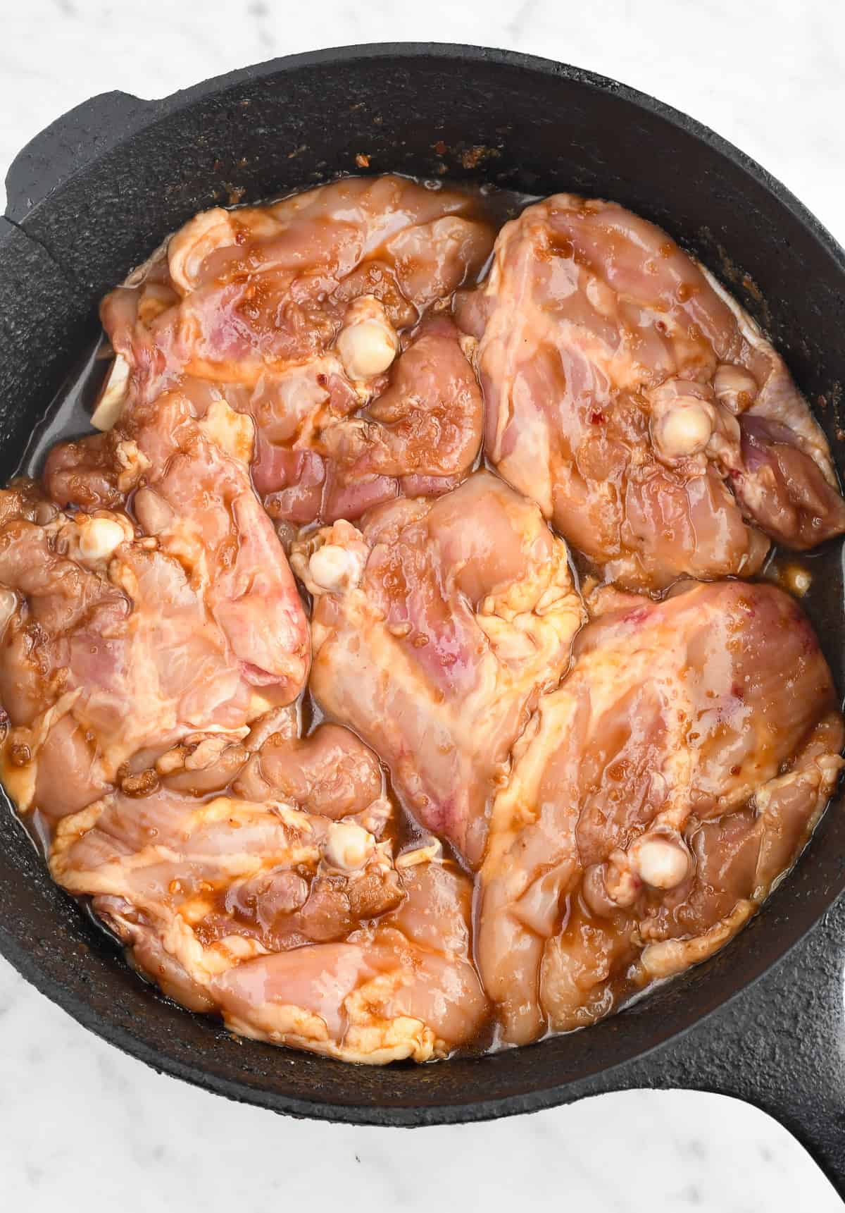 3. Pat the chicken thighs dry and place them in a snug ovenproof skillet, cast iron pan or baking dish, fitting them close together. Avoid using a sheet pan, as too much space can cause the sauce to burn.