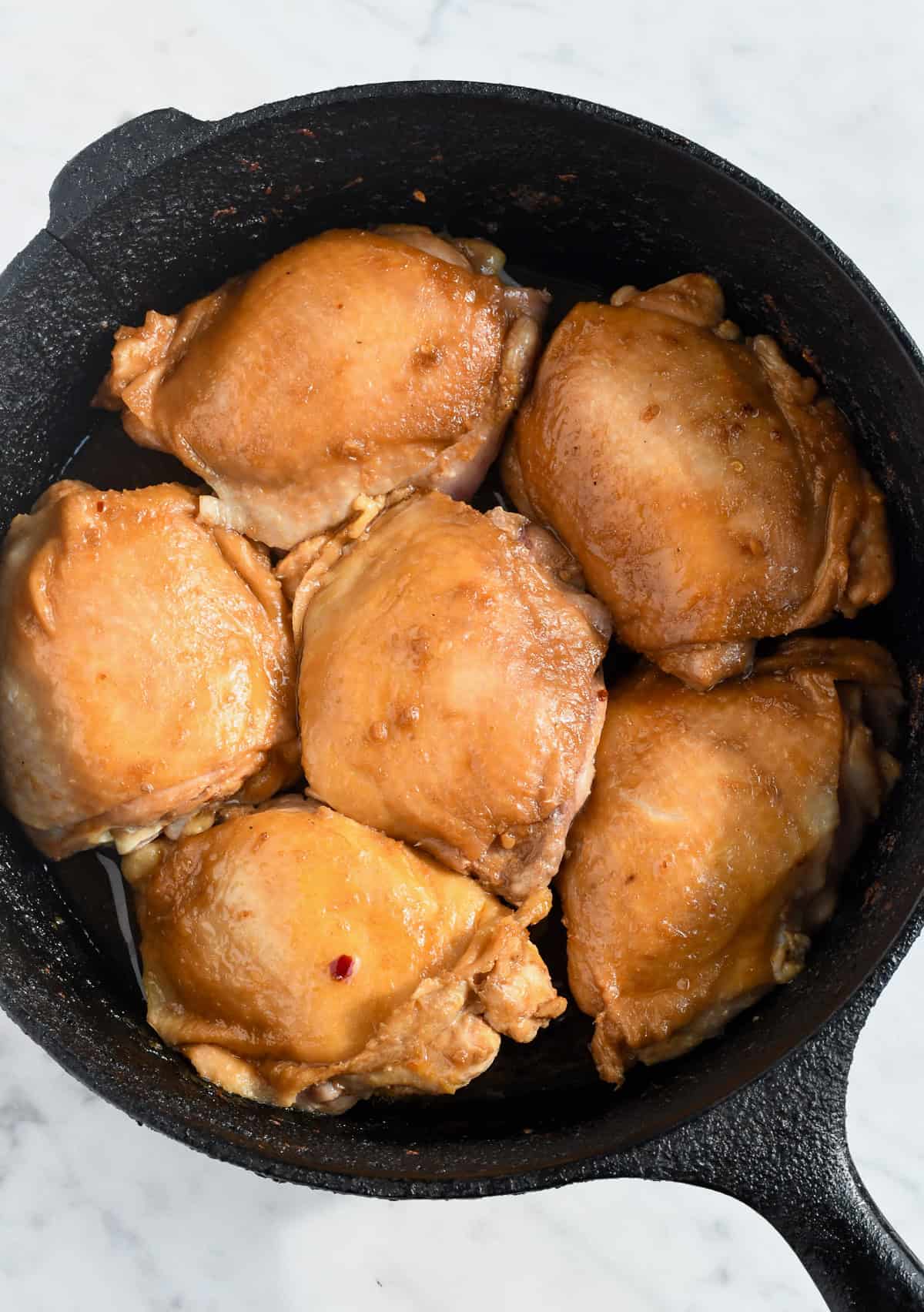 • Chicken thighs (bone-in, skin-on) – juicy, flavorful, and perfect for crisping. You’ll need about 3 1/2 pounds which can be 6-8 thighs depending on the size.