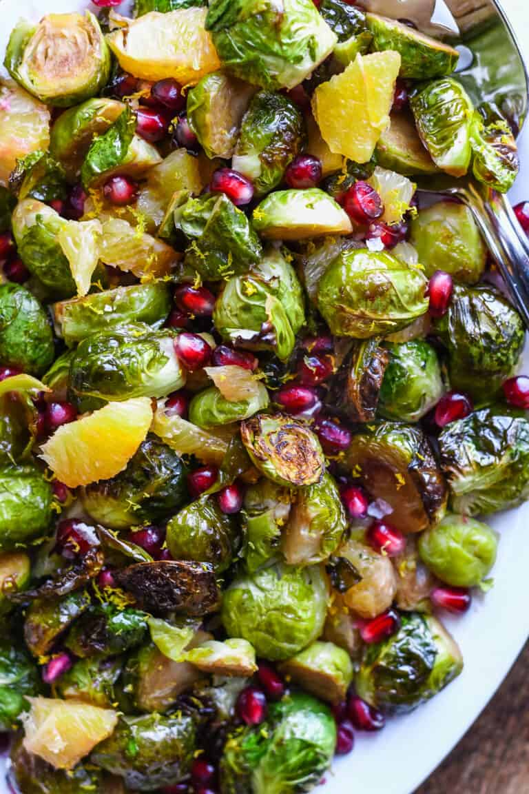 This festive side dish features roasted Brussels sprouts caramelized with balsamic vinegar and tossed with pomegranates and oranges. Paleo & vegan.