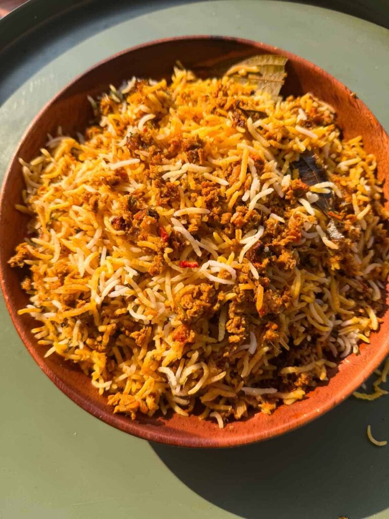 • In the fridge: Store leftover soya keema biryani in an airtight container for up to 2–3 days. The rice will firm up slightly as it cools.